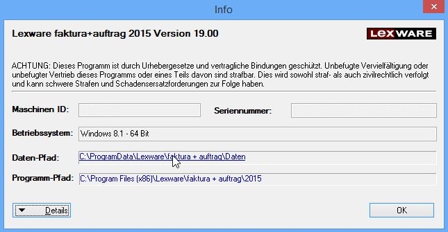 Wenn Sie wissen, wo Ihr F+A-Formularordner ist, können Sie das Folgende getrost überlesen. Ansonsten: Gehen Sie im Hauptmenü von F+A auf das [ ? ] … anschließend klicken Sie auf [Info].